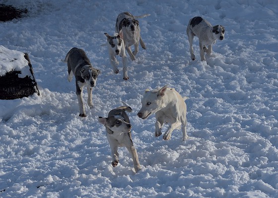 Update-Icy unsere Stammhuendin, und ihre Maedels aus dem B-Wurf. Daisy, aus dem Wurf, hat sich seit Herbst 2019 zu unserer verlaesslichen Mainleaderin entwickelt. Im Waldviertler Hochland haben wir nicht oft Schnee, aber wenn er faellt, dann lieben die Hunde Laufspiele auf der Auslaufwiese.